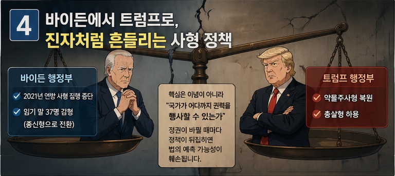 그런 시각으로 보면 이번 정책 전환이 단순한 행정 결정이 아니라는 점이 보입니다. 조 바이든 행정부는 2021년 연방 차원의 사형 집행을 사실상 중단시켰고, 임기 말에는 다수의 연방 사형수에 대해 종신형으로 감형하는 조치를 단행했습니다. 트럼프 행정부의 이번 결정은 그 방향을 정면으로 뒤집는 것입니다.