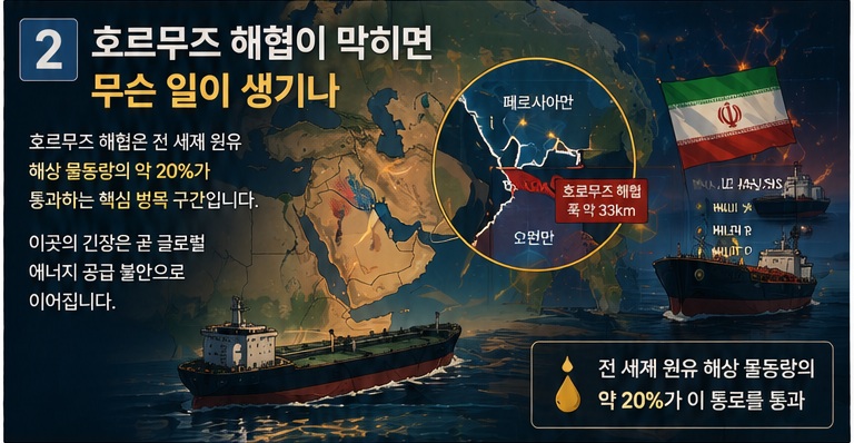 핵심은 호르무즈 해협(Strait of Hormuz)입니다. 여기서 호르무즈 해협이란 페르시아만과 오만만 사이를 잇는 폭 약 33km의 좁은 수로로, 전 세계 원유 해상 물동량의 약 20%가 이 통로를 통과합니다. 전 세계 석유 공급의 핵심 병목 구간이라고 이해하면 됩니다.