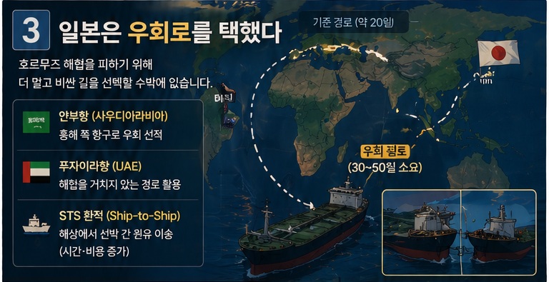 그래서 일본이 선택한 방법이 우회 선적입니다. 사우디아라비아의 얀부항이나 아랍에미리트 푸자이라항처럼 홍해 쪽에 접한 항구에서 출발해 해협 자체를 피하는 경로를 택한 것입니다. 또 일부 물량은 해상에서 선박 간 원유를 옮기는 STS(Ship-to-Ship)