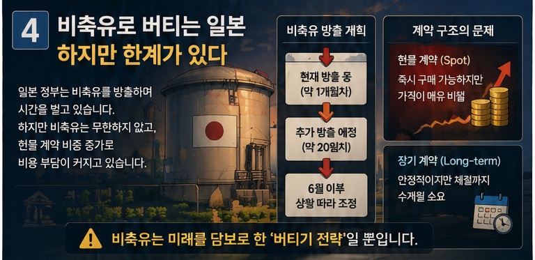 저도 자료를 보면서 "지금 버티는 게 아니라 미래를 담보로 잡은 것"이라는 느낌을 받았습니다. 비축유는 무한히 쓸 수 있는